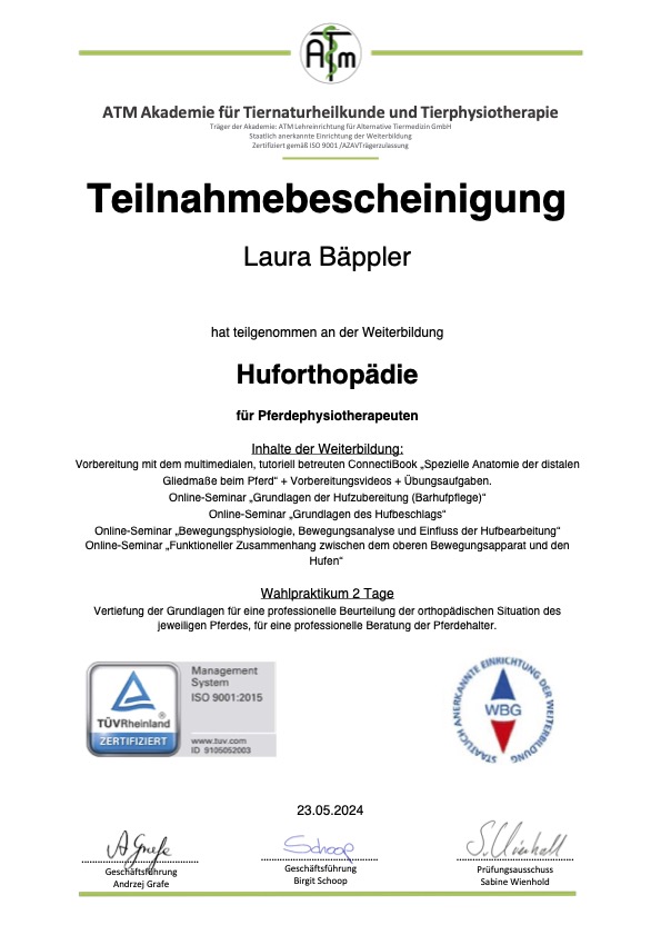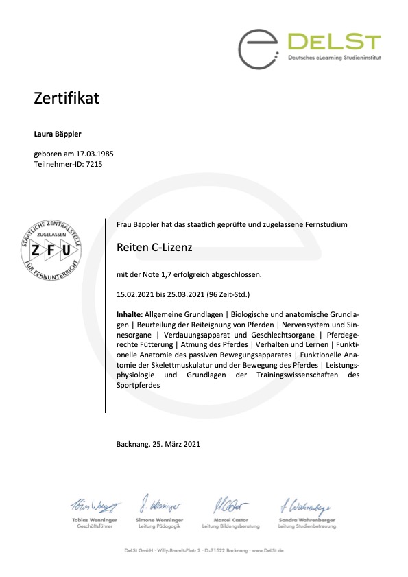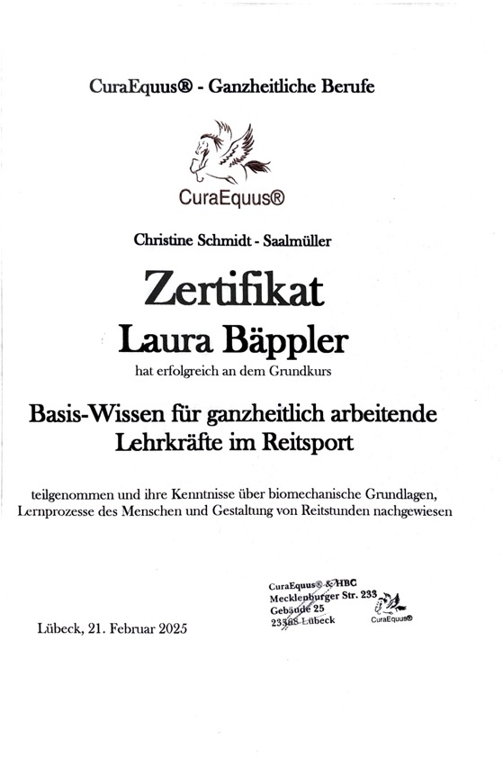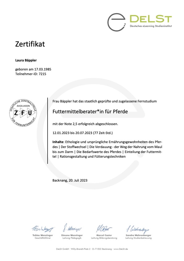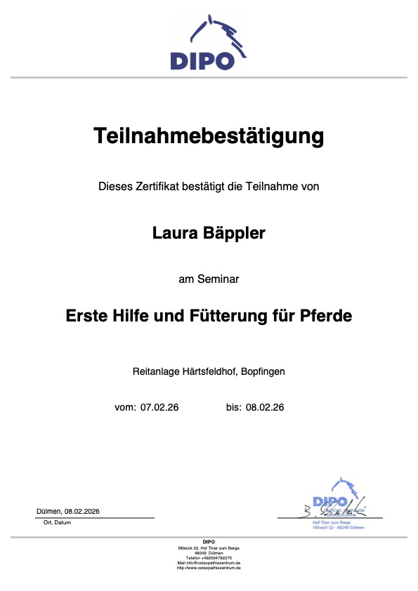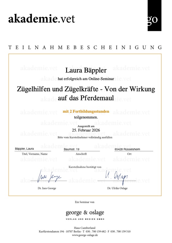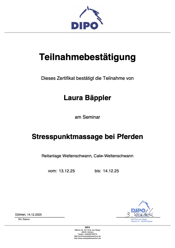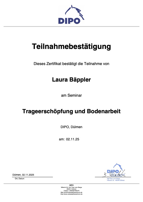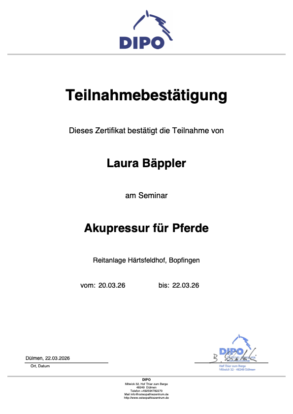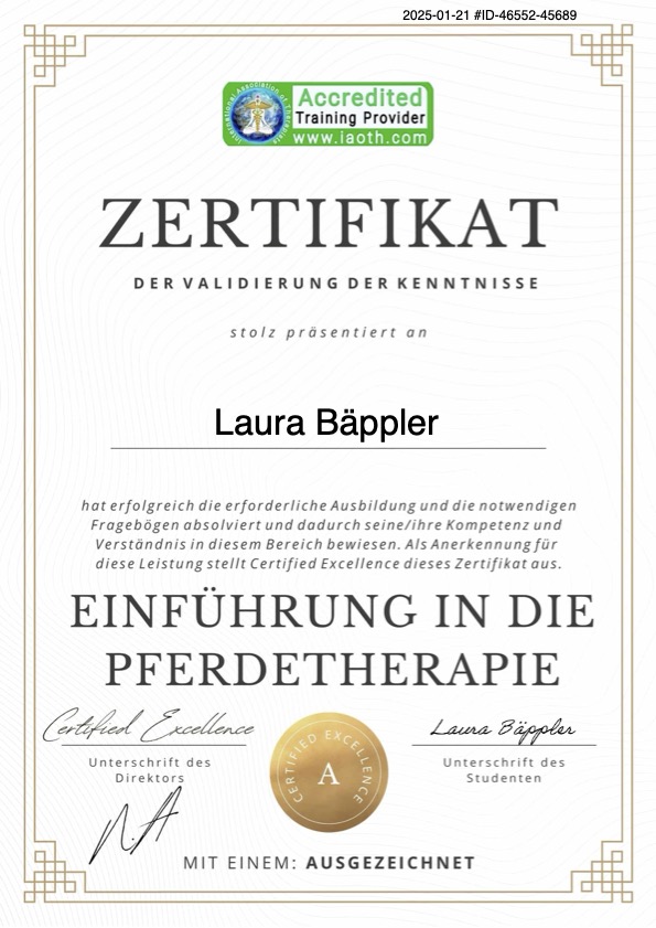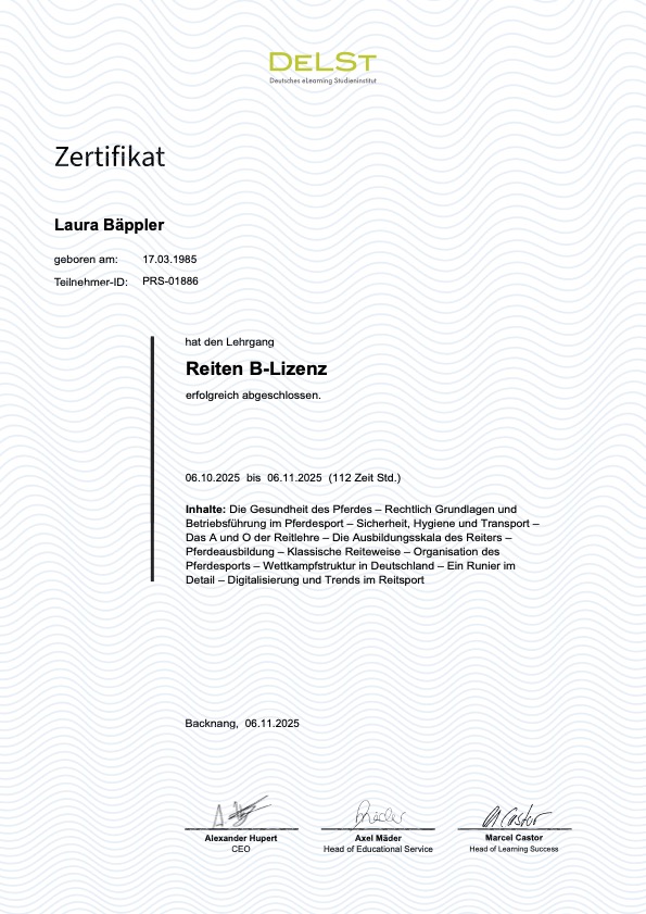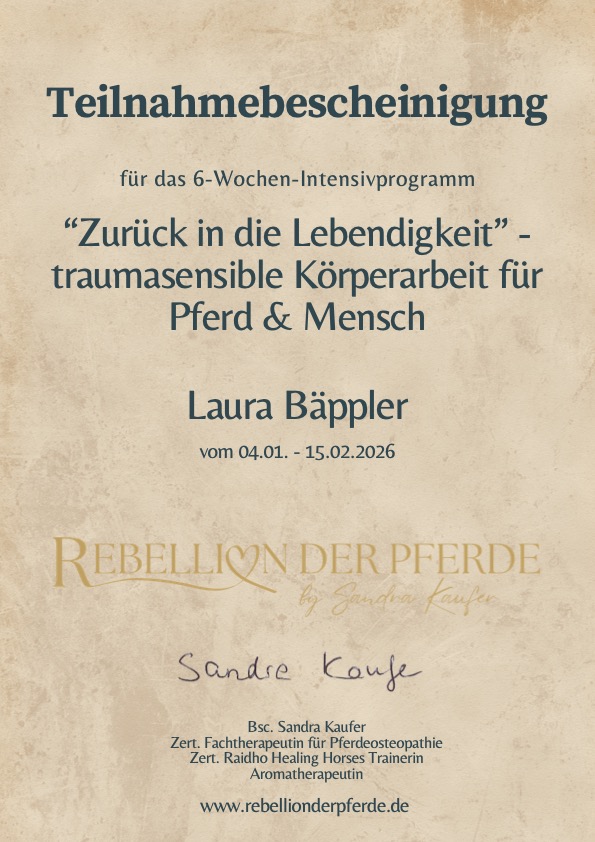 Ich liebe Lernen, weil Entwicklung für mich zum Leben gehört. Weiterbildungen in Theorie und Praxis geben mir Freude, vor allem wenn daraus klare Handgriffe und echte Anwendung im Alltag werden, und deshalb teile ich mein Wissen gern – hier findest du einige meiner Qualifikationen und Zertifikate im Bereich Pferd und/oder Mensch.